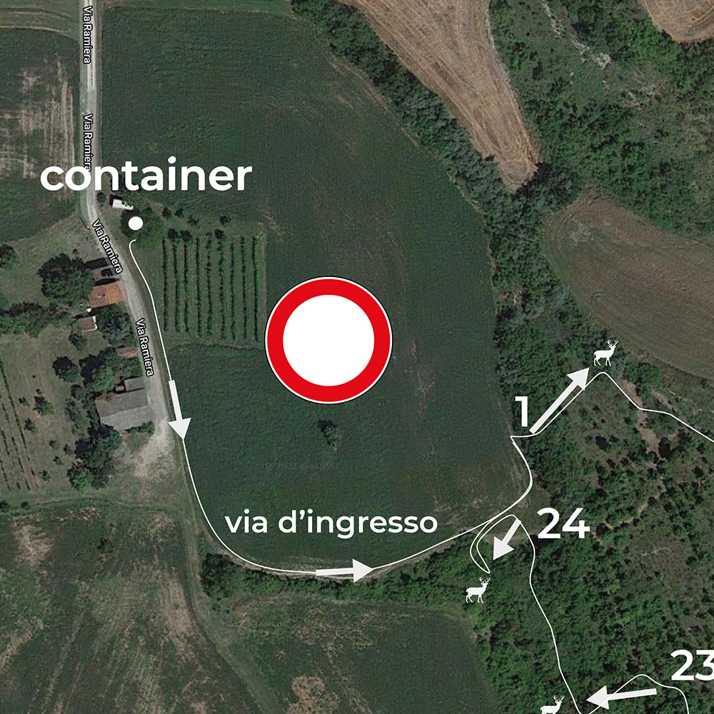 facciamo presente a tutti gli utenti del campo La Ramiera che per motivi di sicurezza e di rispetto delle coltivazioni, la via di ingresso al circuito segue il bordo del campo coltivato a salire e poi, svoltando a sinistra lo costeggia fino a scendere verso la piazzola 24 e più in basso la 1.
