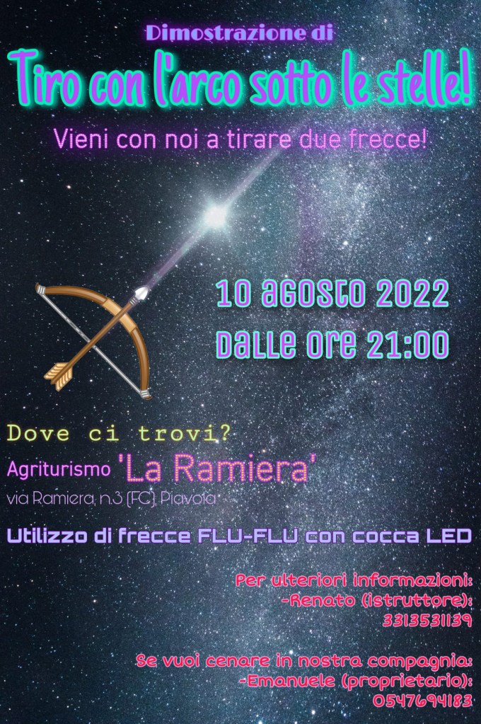 Il nostro istruttore Renato ha preparato tante frecce flu-flu con star-light che lanceremo tutti assieme la sera del 10 agosto, ricreando una suggestiva pioggia di “stelle cadenti”