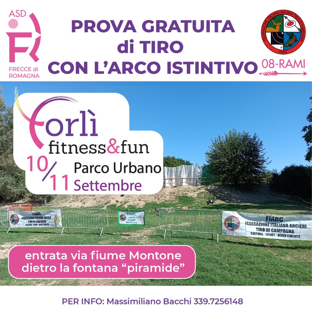 le Frecce di Romagna saranno presenti all’evento di inizio delle attività sportive “Forlì fitness&fun”, al parco urbano di Forlì oggi, sabato 10 settembre, dalle 15 alle 19:30 e domenica 11 dalle 10:30 alle 19. Venite a provare il tiro con l’arco istintivo! tutto gratuito, ovviamente!